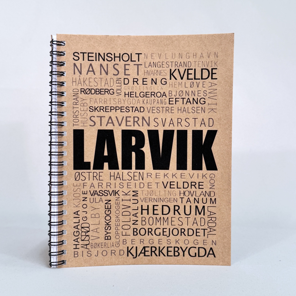 Omslaget er preget med stedsnavn rundt om i Larvik.