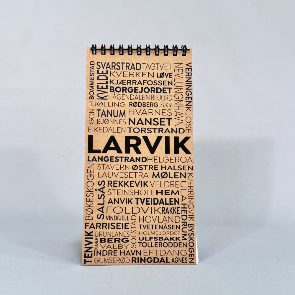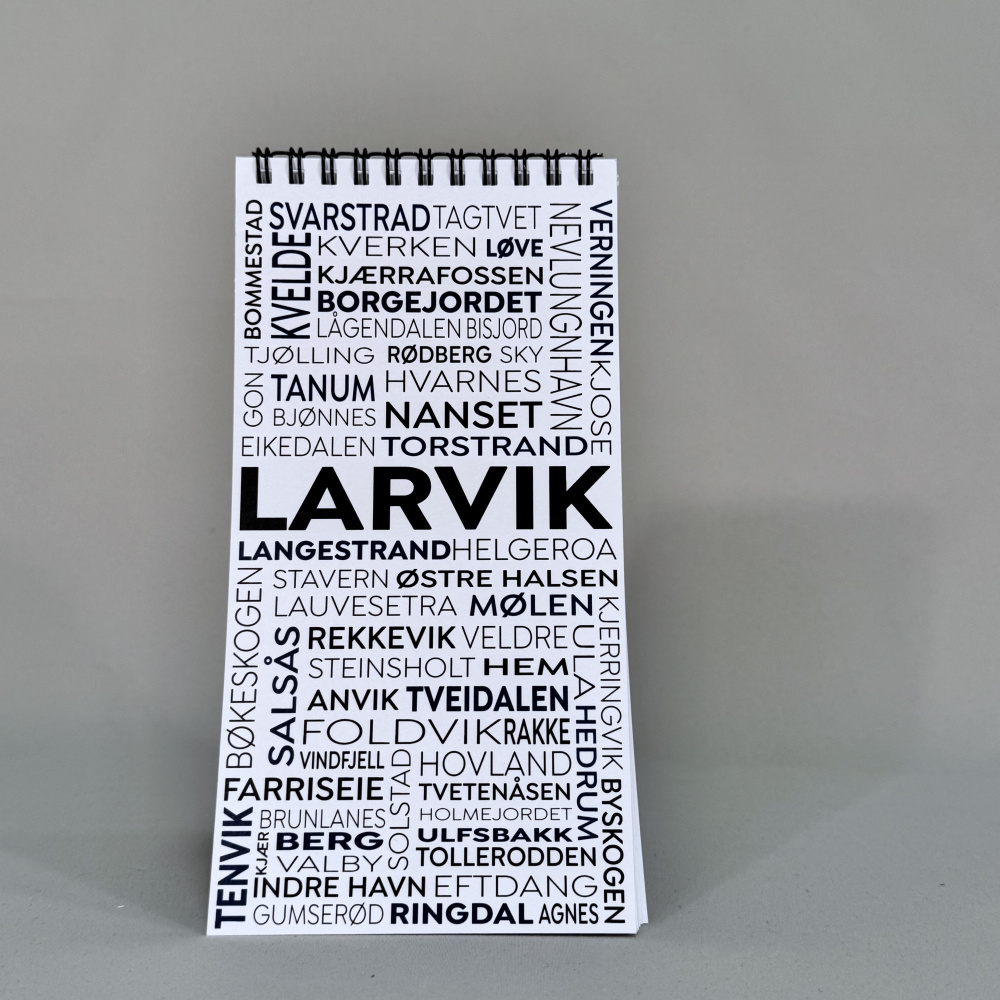 Omslaget er preget med stedsnavn rundt om i Larvik.