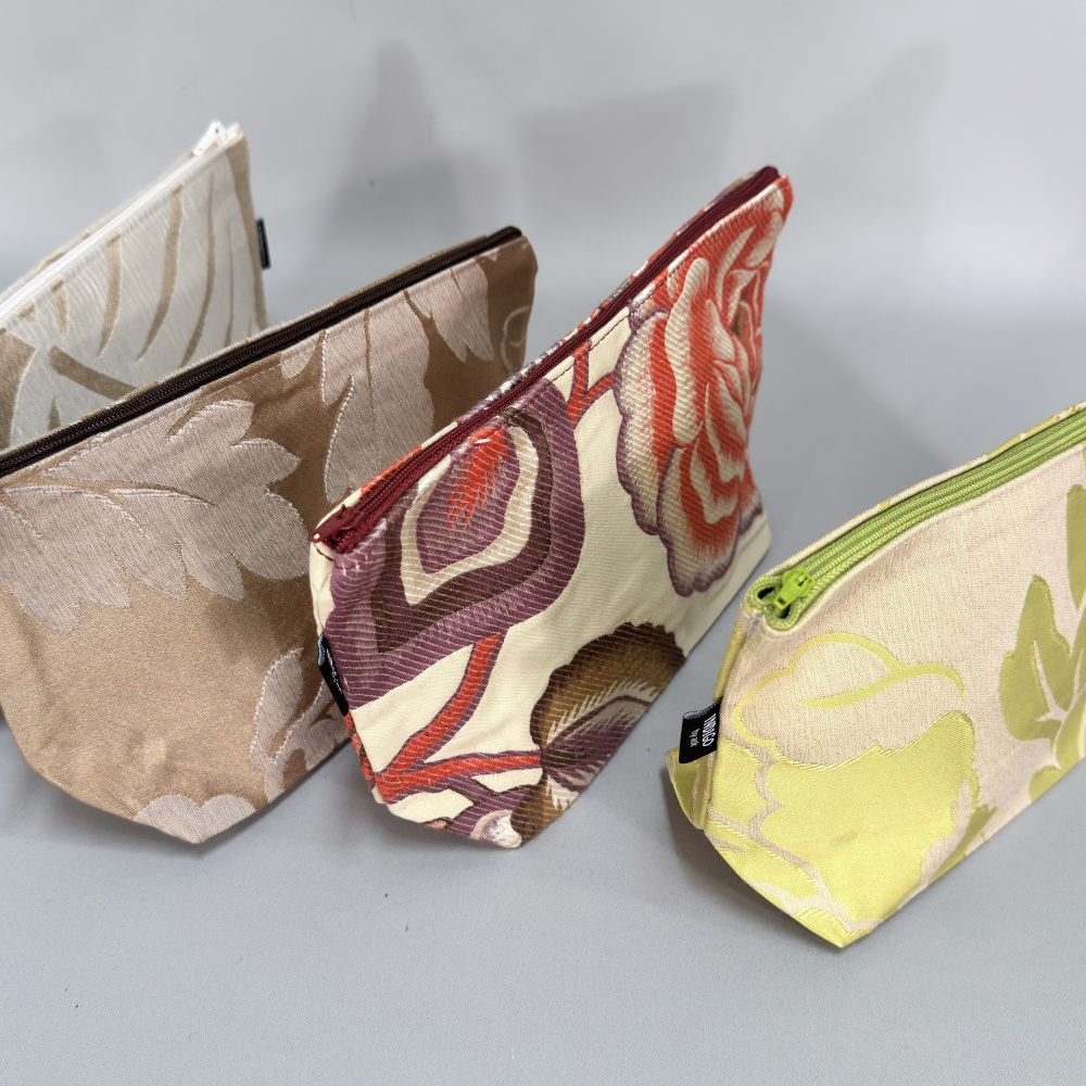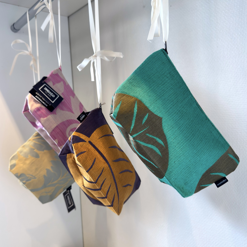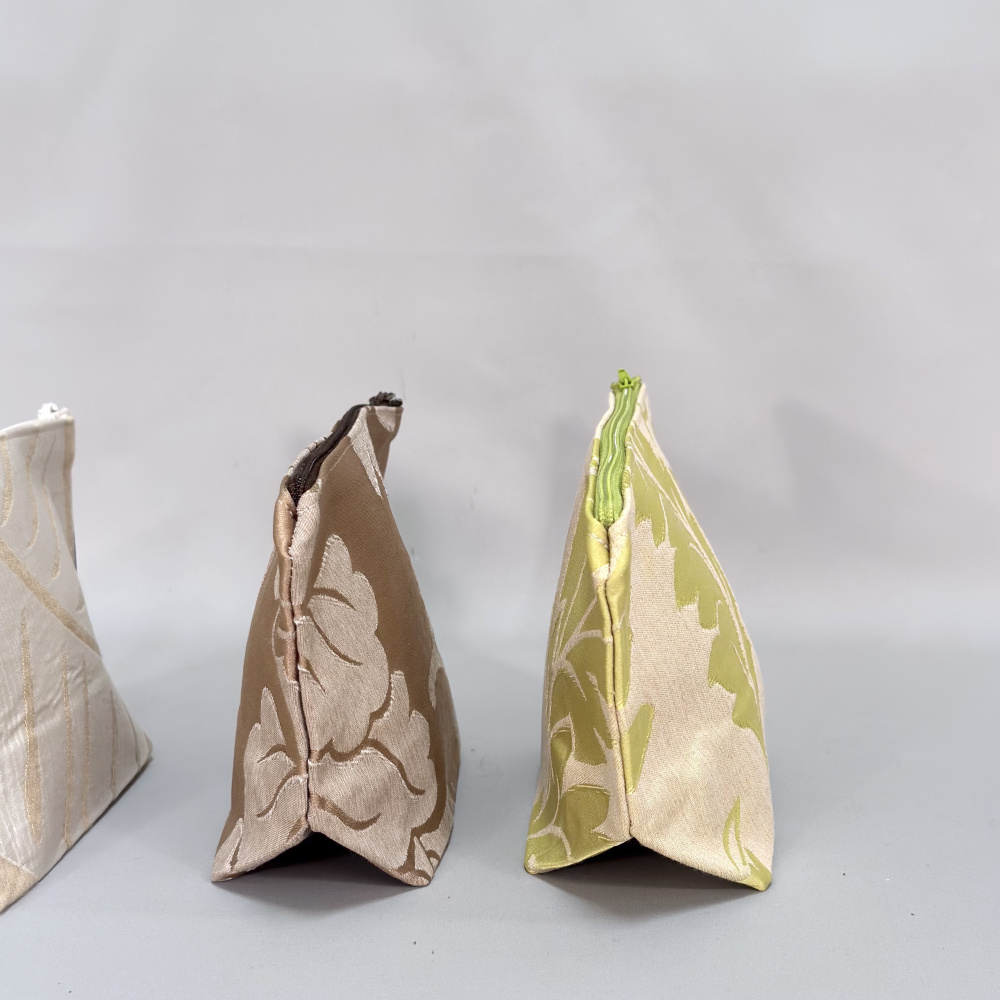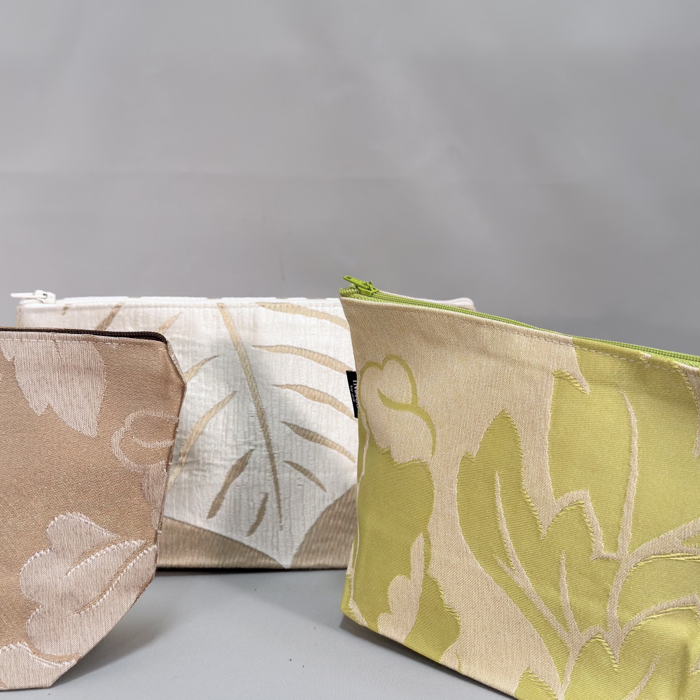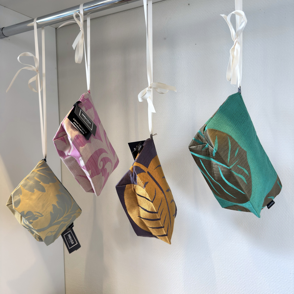 Dette er en unikum vare laget av tekstilprøver. Hver enkelt sminkepung er unik.