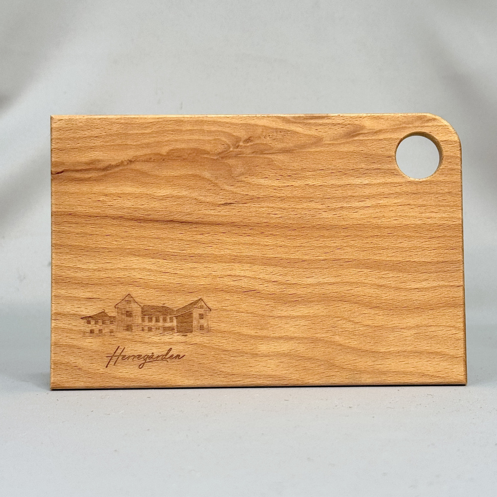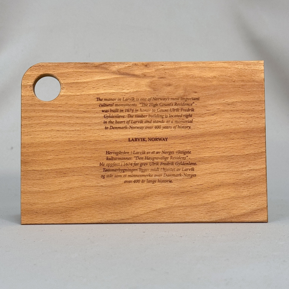 Det er gravert inn en illustrasjon av Herregården, og en tekst på norsk og engelsk på baksiden. Se også fjøl og glassbrikke med samme motiv.